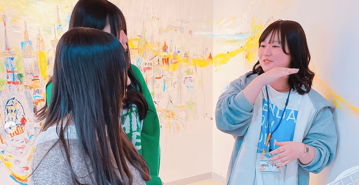 体験授業には、姉妹園のみのりこども園のこどもたちが一緒にあそびに参加してくれるので、こどもたちともふれあえるオープンキャンパスが魅力だよ!絵本作家さんに描いてもらった壁画の迫力がすごいので、ぜひ一度見て欲しい!